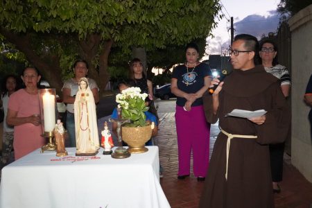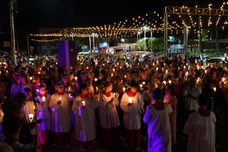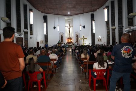 A caminhada teve como destino a Matriz Divino Espírito Santo, onde, às 19 horas, a comunidade se reuniu para a celebração da Santa Missa, encerrando a noite com profunda espiritualidade e gratidão. A celebração foi presidida pelo Ministro Custodial Frei Rogério Viterbo de Sousa, OFM, que destacou em sua homilia a importância de cultivar a paz interior e de ser sinal da luz de Cristo no mundo.