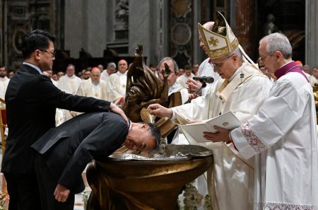 Um neófito sendo batizado pelo Papa Leão   (@Vatican Media)