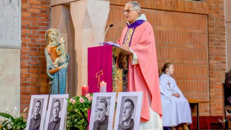 “Qualquer que seja a nossa vocação, a nossa profissão, a nossa responsabilidade, estamos comprometidos, como discípulos de Cristo, com o serviço aos nossos irmãos e irmãs, onde quer que Deus, na Sua Providência, nos tenha colocado. […] A fé nunca é privada; deve encontrar expressão no serviço concreto aos nossos irmãos e irmãs. […] Esta beatificação convida-nos a olhar para o presente e a preparar o futuro. […] Estamos a viver, temos vivido, uma reconciliação entre os povos. É uma obra que nunca termina e que cada geração deve continuar. […] Todos vós, jovens, que talvez não frequenteis a igreja, da França e da Europa, vós que já não vêis sentido na vossa vida, olhai para Cristo, o Príncipe da Paz, o Príncipe do amor e não do ódio, aprendei com Ele, como os vossos irmãos e irmãs mais velhos, os mártires, hoje beatificados, aprendei com Ele a comprometerem-se com o bem dos vossos irmãos e irmãs!”, exortou o Cardeal Jean-Claude Hollerich, Arcebispo do Luxemburgo, na sua homilia. O ponto alto da celebração foi a leitura em voz alta dos cinquenta nomes dos mártires e a inauguração da obra de Nicolas de Palmaert, que retrata os 50 mártires — agora abençoados — ascendendo simbolicamente ao céu ao redor da cruz de Cristo.