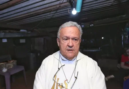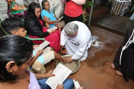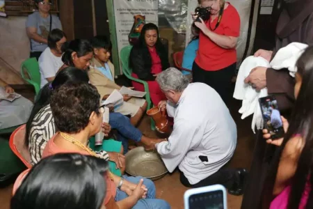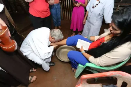 A cerimônia foi realizada sob uma tenda branca montada sobre tábuas de madeira, em meio a barracos de lona e ruas alagadas, após um dia de chuva intensa. O ritual, que integra a tradição católica da Quinta-Feira Santa, simboliza humildade e acolhimento, e foi promovido como forma de levar a presença da Igreja a comunidades em situação de vulnerabilidade.