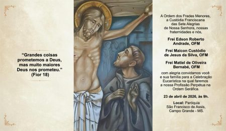 23 de abril: Celebração Eucarística, na qual o Ministro Geral recebe a profissão solene de Frei Edson Roberto Andrade, OFM, Frei Maicon Custódio de Jesus da Silva, OFM, e Frei Matiel de Oliveira Bernabé, OFM. A celebração acontecerá na Igreja São Francisco de Assis e será transmitida ao vivo pela TV Imaculada de Campo Grande e pelo canal do YouTube.